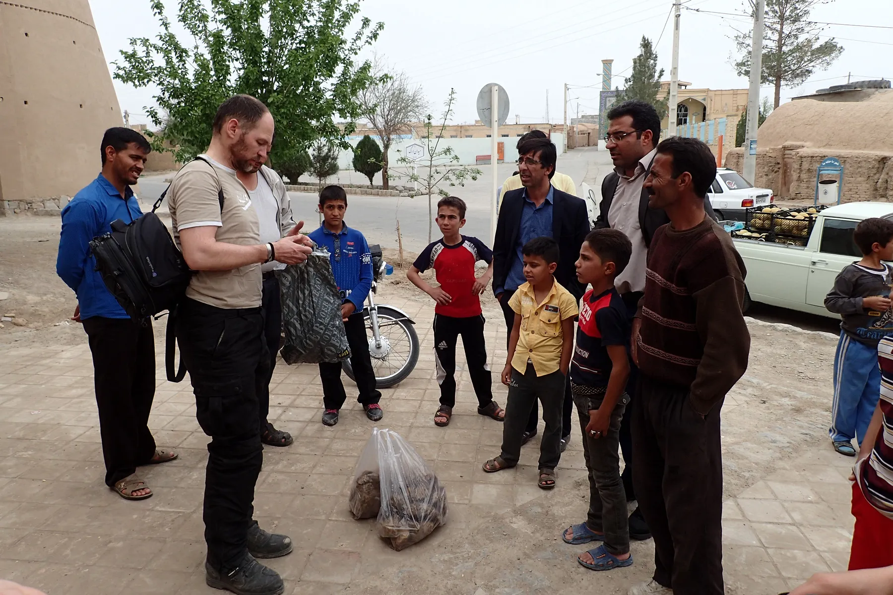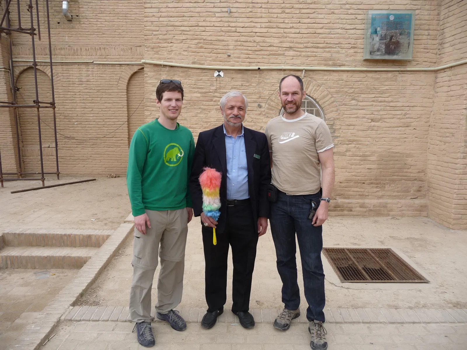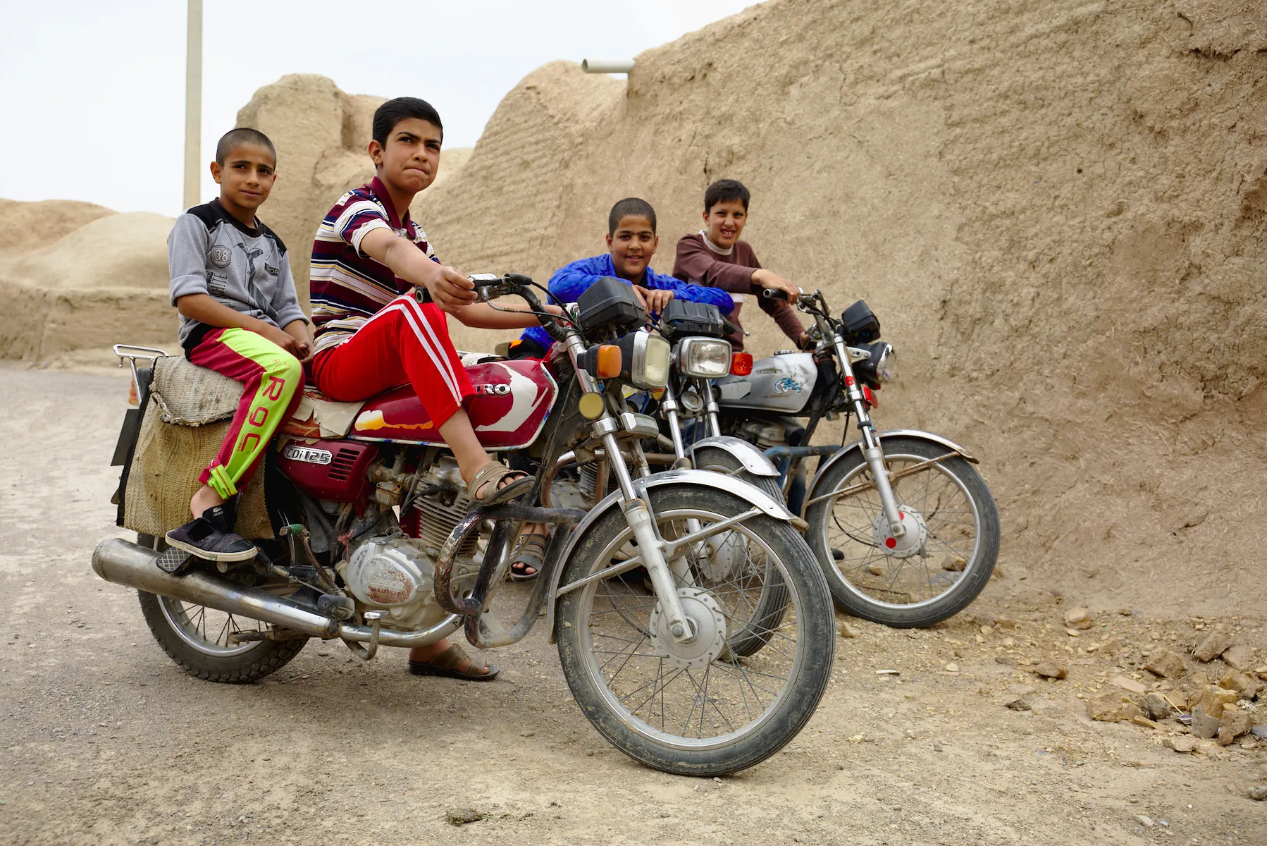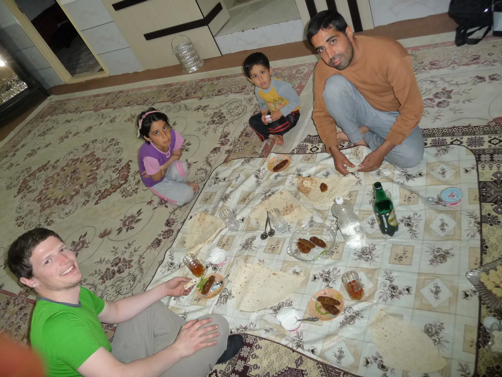 Im Iran treffen wir auf unglaublich liebevolle, offene und hilfsbereite Menschen. Kaum machen wir irgendwo Halt, kommen die Iraner auf uns zu, erkundigen sich nach unserer Herkunft und unseren Plänen, wollen mit uns und unseren Motorrädern Fotos schiessen und laden uns zum Tee, zum Essen oder gleich zum Übernachten ein. So sind wir zum Beispiel zu Gast bei der Familie eines Kriegsveteranen aus dem Golfkrieg; ein Tankstellenwart erbarmt sich unser nach nasser kalter Fahrt und organisiert Gasheizung, Decken und Tee; der Chefmechaniker lädt uns nach getaner Reparatur an der Felge zum Übernachten zu seiner Familie ein; und viele Frauen wirken fliessig im Hintergrund, wenn uns ihre Männer Gastfreundschaft anbieten. In konservativen Familien dürfen wir den Frauen nicht die Hand reichen, sie nicht ansprechen, sie dürfen nicht mit aufs Familienfoto und sie essen auch nicht mit uns - Gleichberechtigung ist kein Thema. Einen Ruhetag verbringen wir im Sommerhaus von Saeed. Er zeigt uns die Umgebung, organisiert eine Spezialführung durch eine heilige muslimische Stätte und stellt uns seine einflussreichen Cousins und Freunde vor. Zum Frühstück geniessen wir Schafskopf, eine iranische Spezialität, und noch etwas mehr geniessen wir am Nachmittag die im Garten grillierten Kebab-Spiesse.