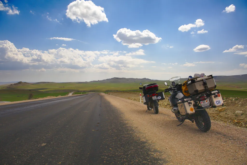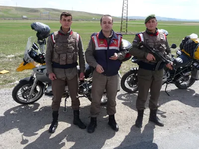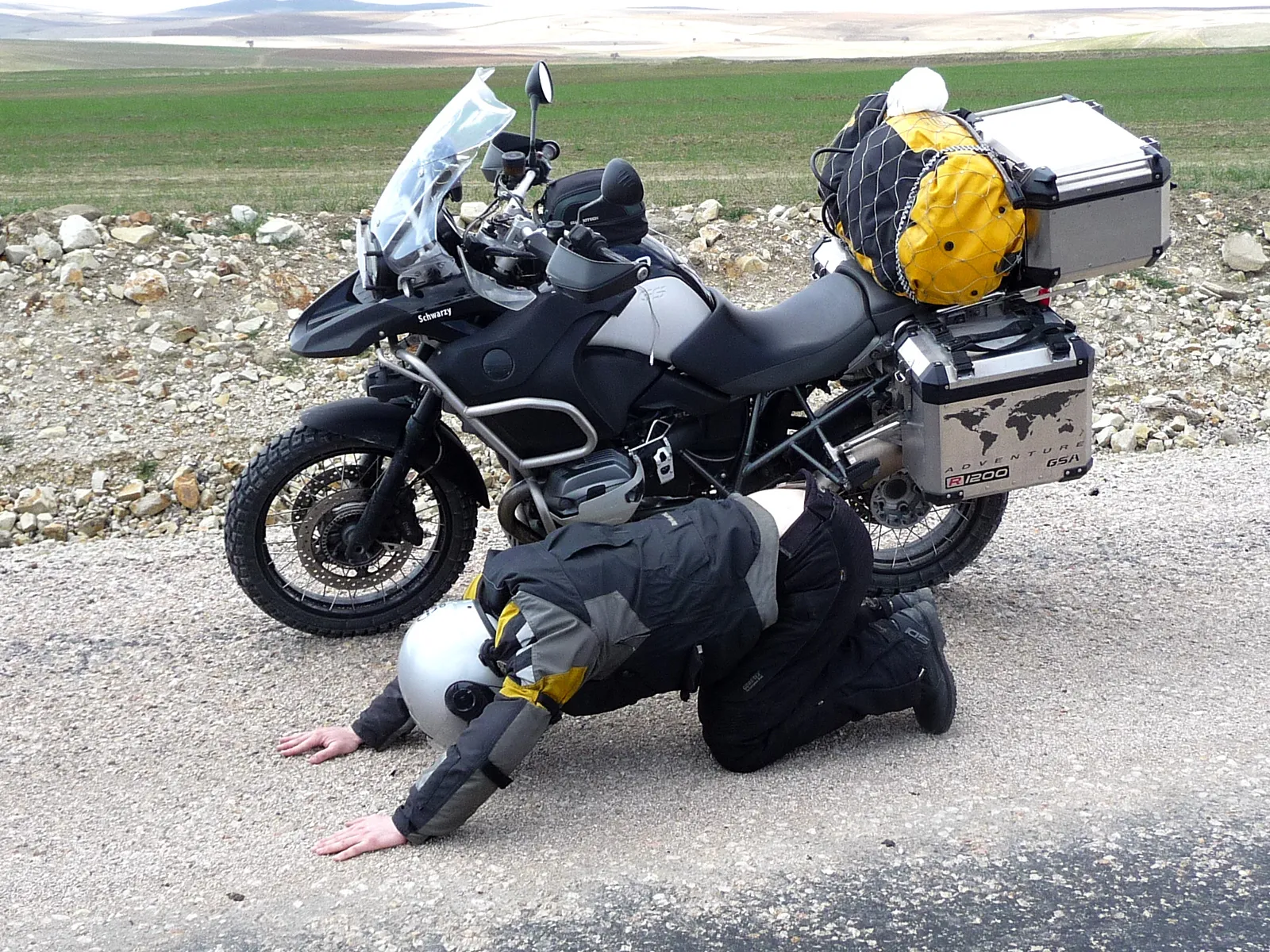 Die nächsten beiden Tage führt uns die Route durch Anatoliens wunderschöne Hügellandschaften, nur ab und zu ein Halt, um Benzin und Çai zu tanken. Auf Murats Bauernhof schlagen wir unser Zelt auf und sind froh, dass wir uns nach dem Ruf des Muezzins um 5 Uhr nochmals im Schlafsack umdrehen können. Nachdem die ersten Regentropfen unserer Reise kurz an die Zeltwand geklopft haben, stehen wir wieder im Trockenen auf und satteln unsere Motorräder. Zum ersten Mal werden wir von einer Polizeistreife angehalten. Zu schnell? Sicherheitslinie übersehen? Bikes nicht in Ordnung? Entwarnung: Der Chef der Truppe, selber Motorradfahrer, will ein Foto mit uns. Nach dem Shooting nochmals 200 Kilometer bis zu unserem Tagesziel Göreme. Janosch ist übrigens nicht zum Islam konvertiert und betet nicht gegen Mekka - er versucht lediglich, ein akutes Ziehen mit Rückengymnastik zu lindern.