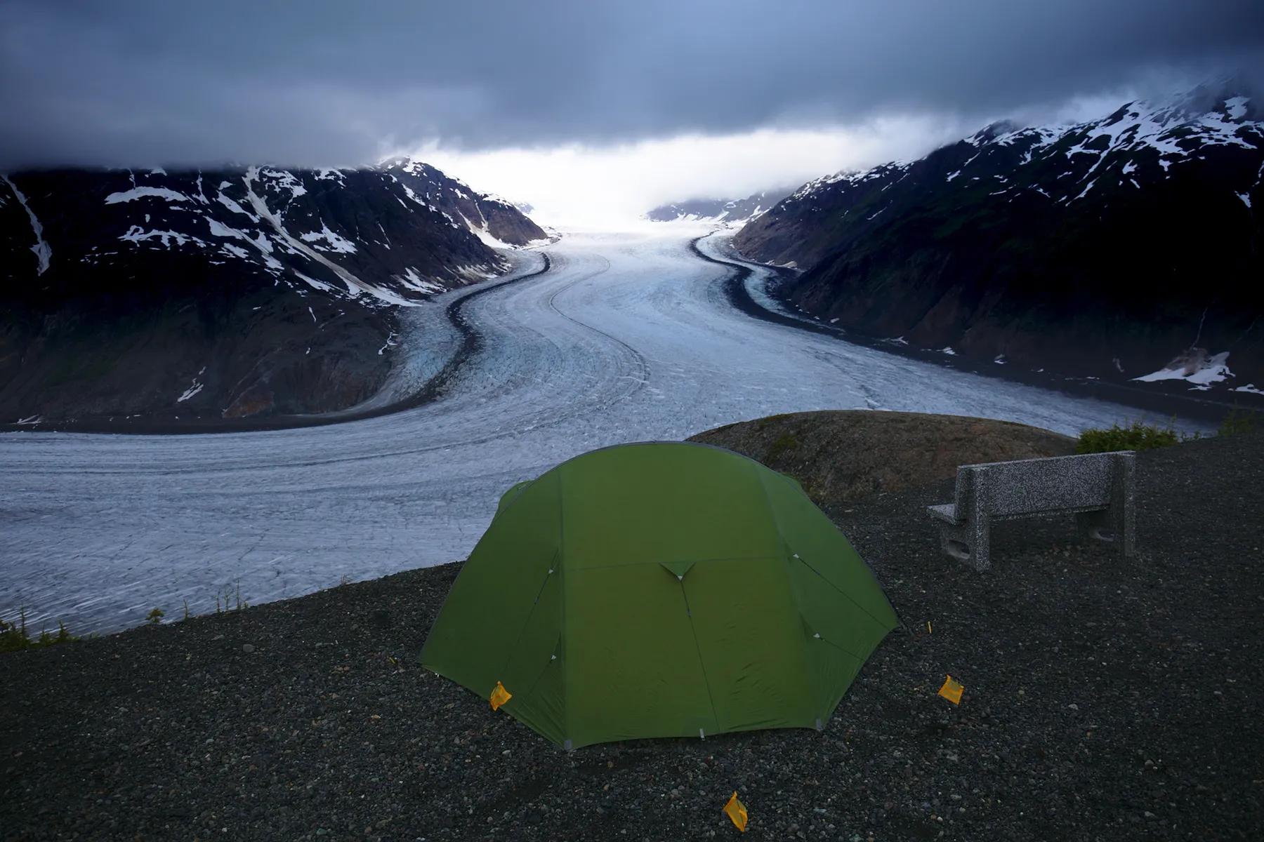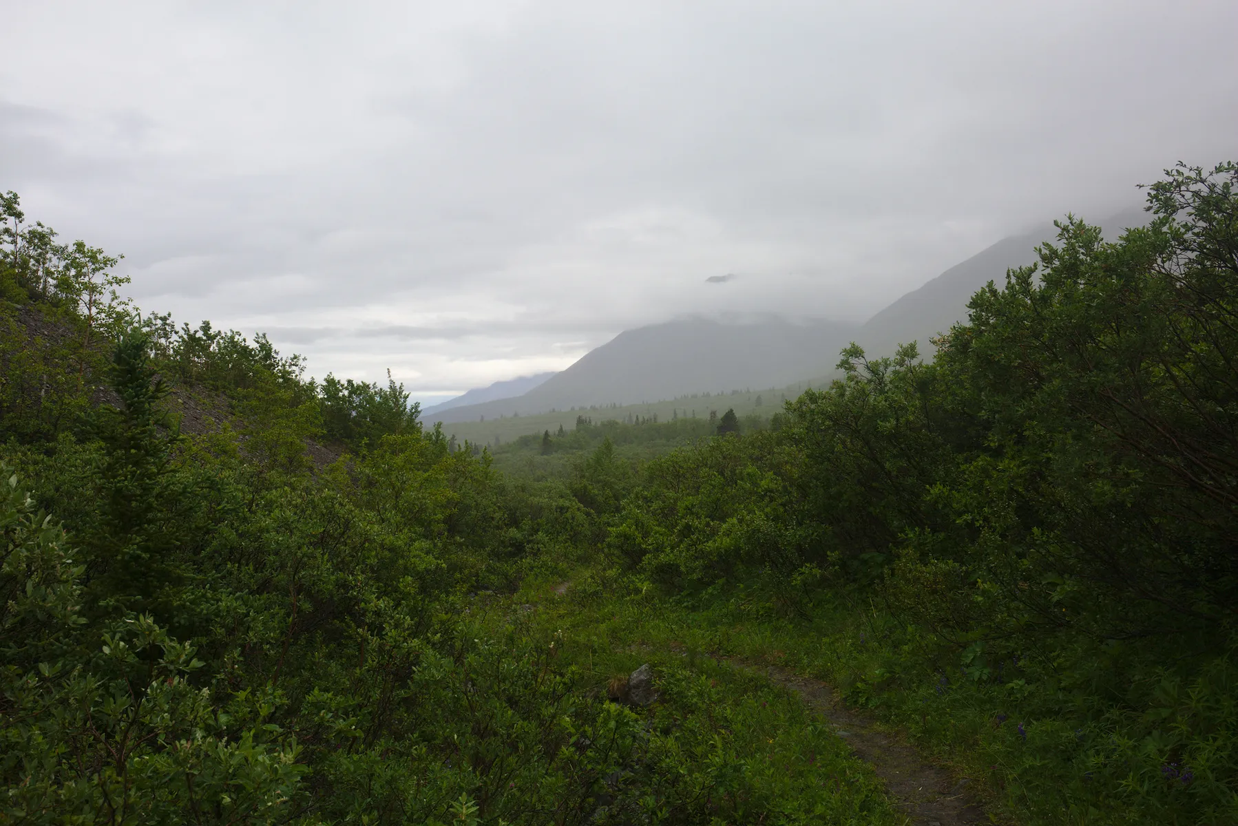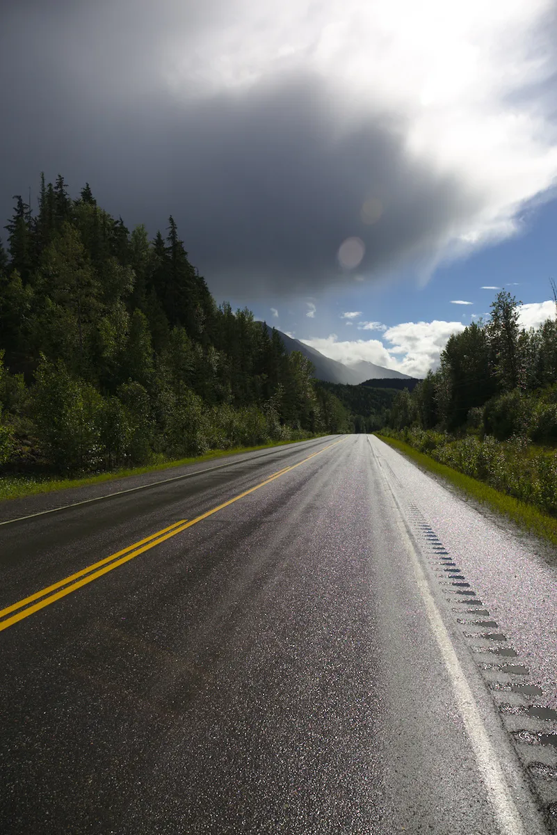 Die restliche Route über den Cassiar und den Alaska Highway ziehen sich nicht zuletzt wegen dem Regen sehr in die Länge, wenngleich die Landschaften prächtig sind. An einem regenfreien Tag mache ich mich auf eine wunderschöne Wanderung im Kluane Nationalpark, wo dank dem Regen die Pfade teilweise zu Bächen wurden. Am Schluss sind die Schuhe dermassen durchtränkt, dass ich einfach durchs Wasser wate.