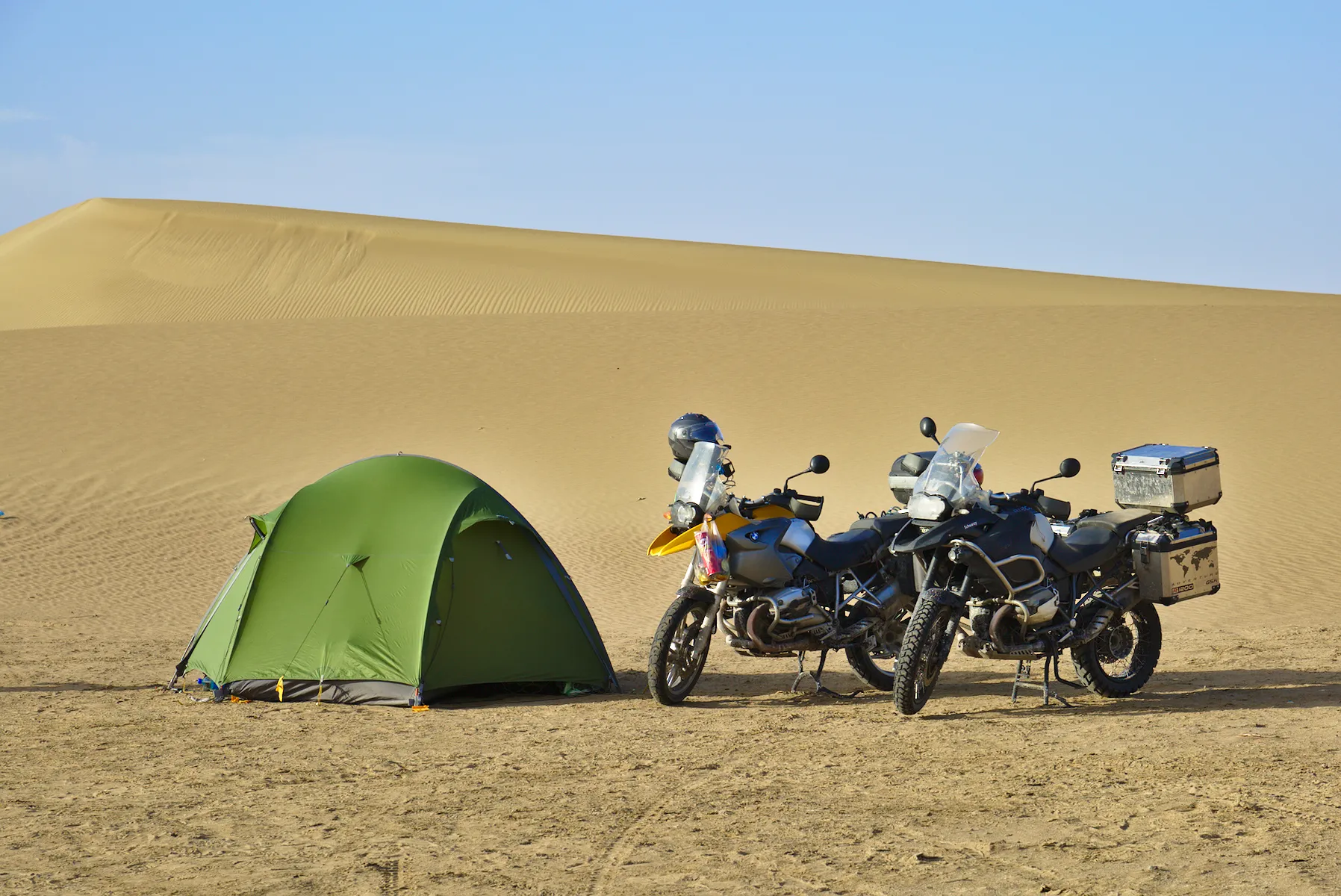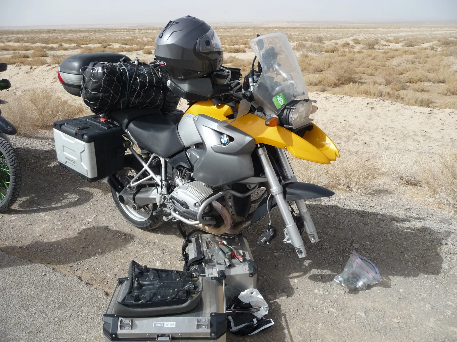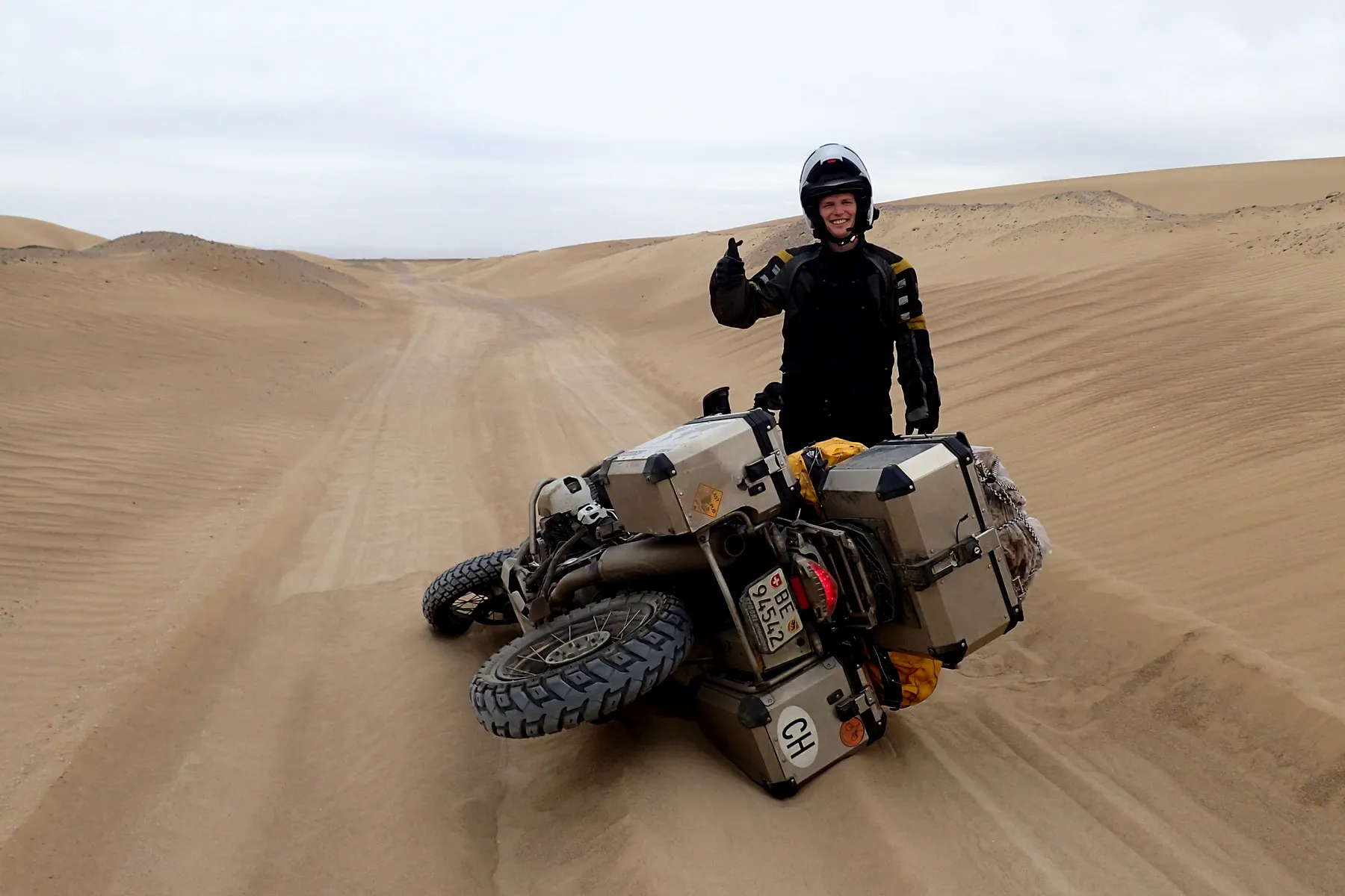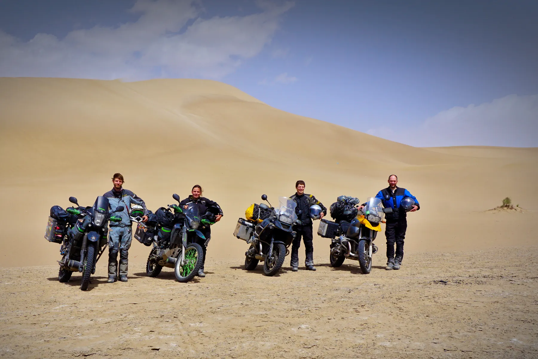 Noch ein paar letzte Fotos vor der tollen Dünen-Kulisse und weiter gehts - allerdings nicht weit. Ein herbes Schlagloch macht Günters Vorderreifen platt und führt zu einem Riss in der Gussfelge, der in einer lokalen Werkstatt provisorisch geschweisst werden muss. Damit lässt es sich bis zur nächsten BMW-Garage, die zwar nicht gerade um die Ecke liegt (über 1’500 km), vorsichtig weiterfahren.