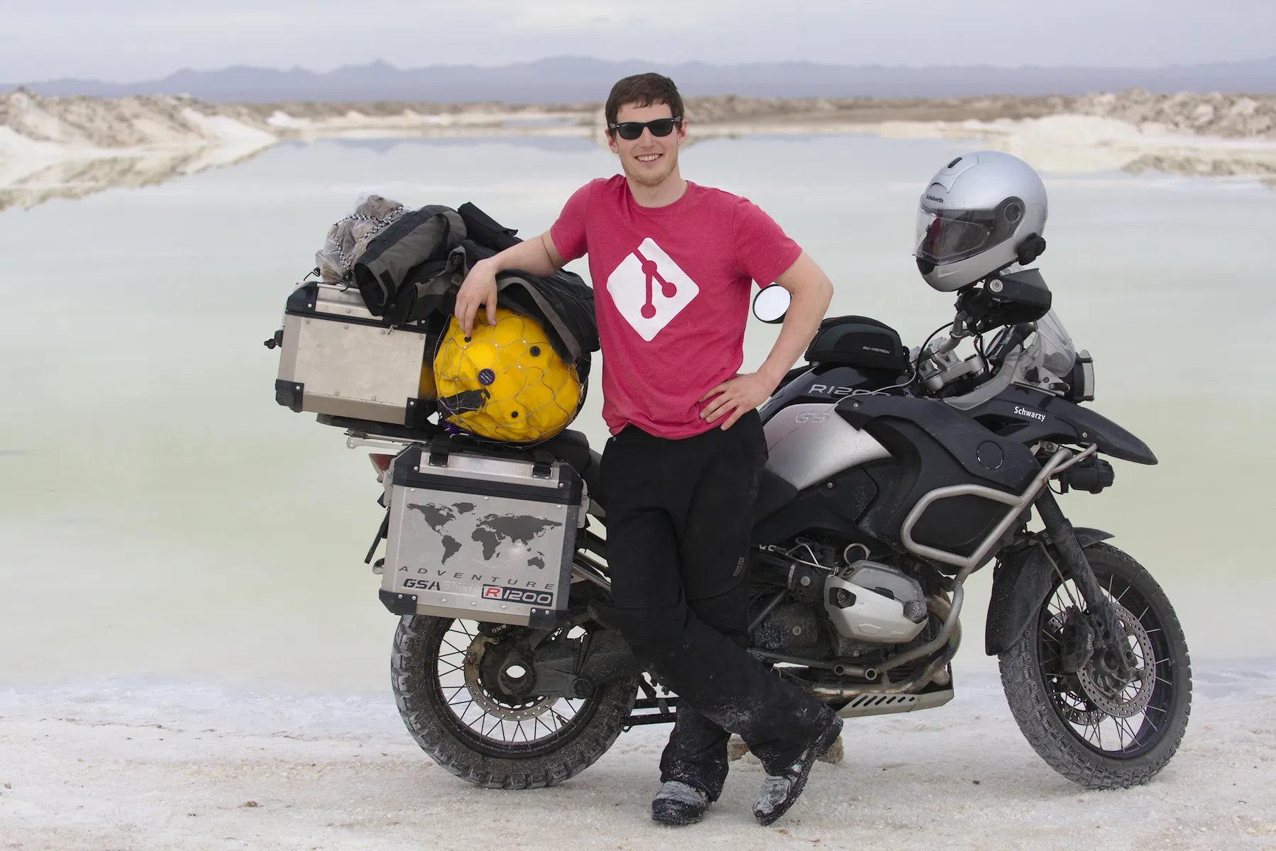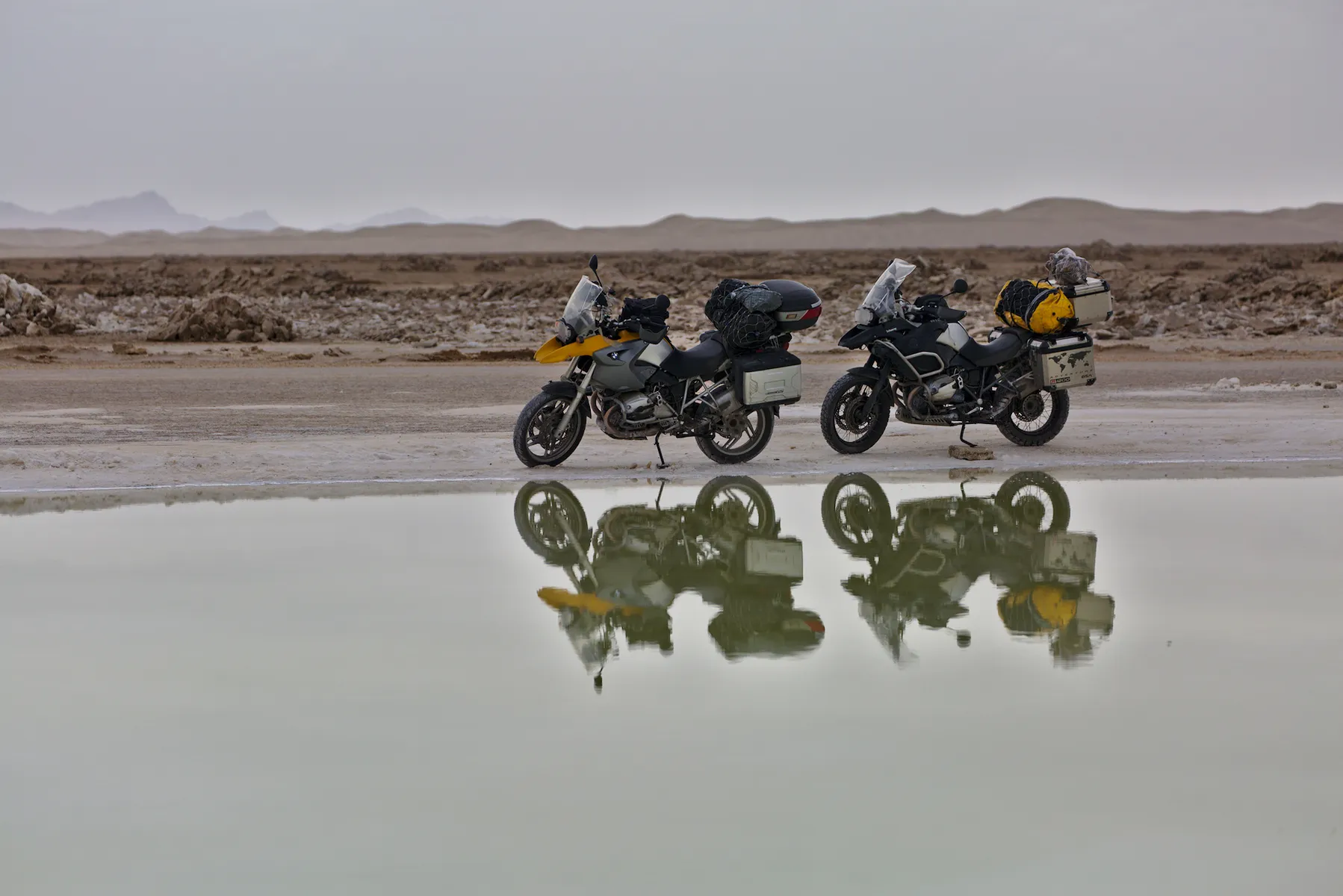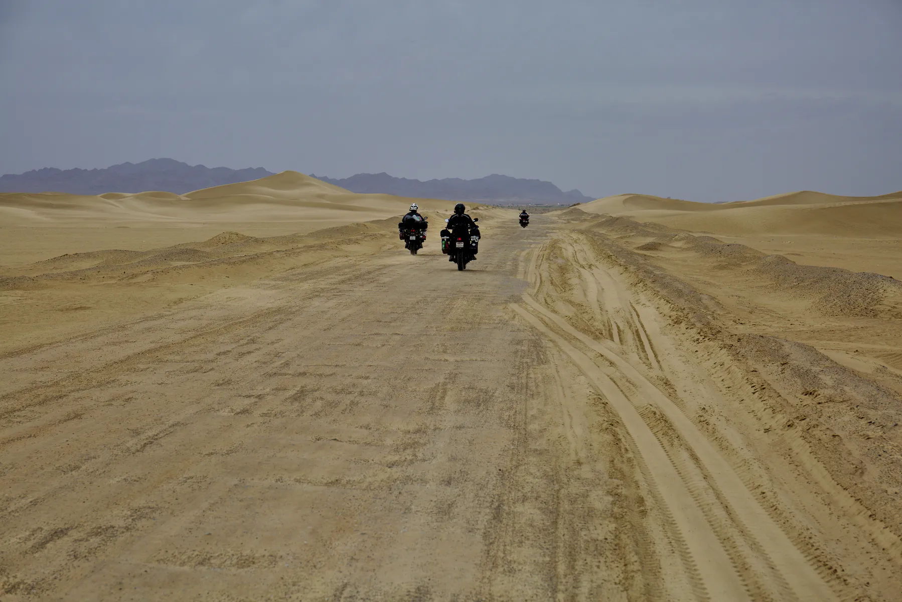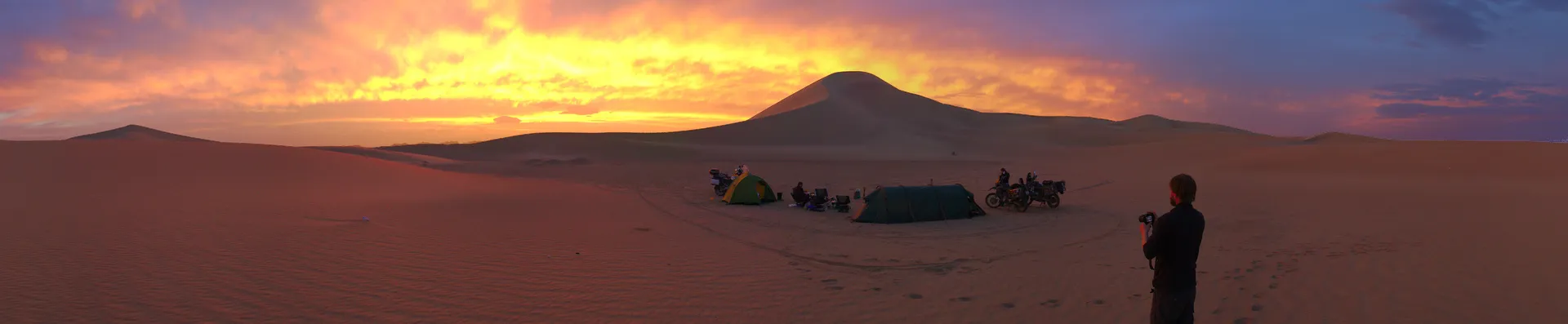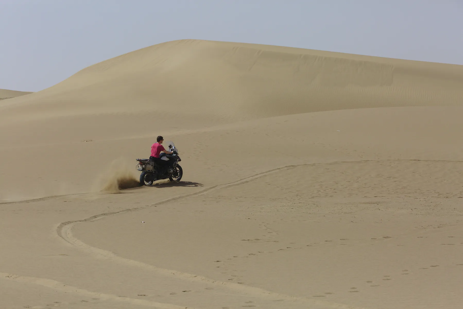 Noch ein paar letzte Fotos vor der tollen Dünen-Kulisse und weiter gehts - allerdings nicht weit. Ein herbes Schlagloch macht Günters Vorderreifen platt und führt zu einem Riss in der Gussfelge, der in einer lokalen Werkstatt provisorisch geschweisst werden muss. Damit lässt es sich bis zur nächsten BMW-Garage, die zwar nicht gerade um die Ecke liegt (über 1’500 km), vorsichtig weiterfahren.